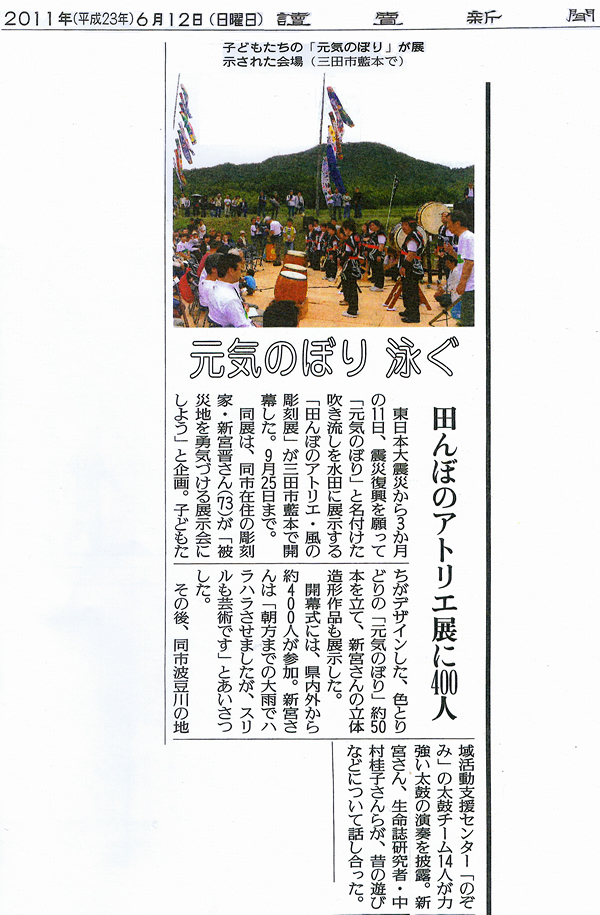 | 2011年6月11日 田んぼのアトリエ、オープニングが開催されました。 当日朝まで降り続いた雨が奇跡のように止み、集った約400人の参加者は、田んぼの中の作品や元気のぼりを鑑賞し、梅雨の合間の好天を楽しみました。 撮影:新宮 夕海、河崎 晃一 |