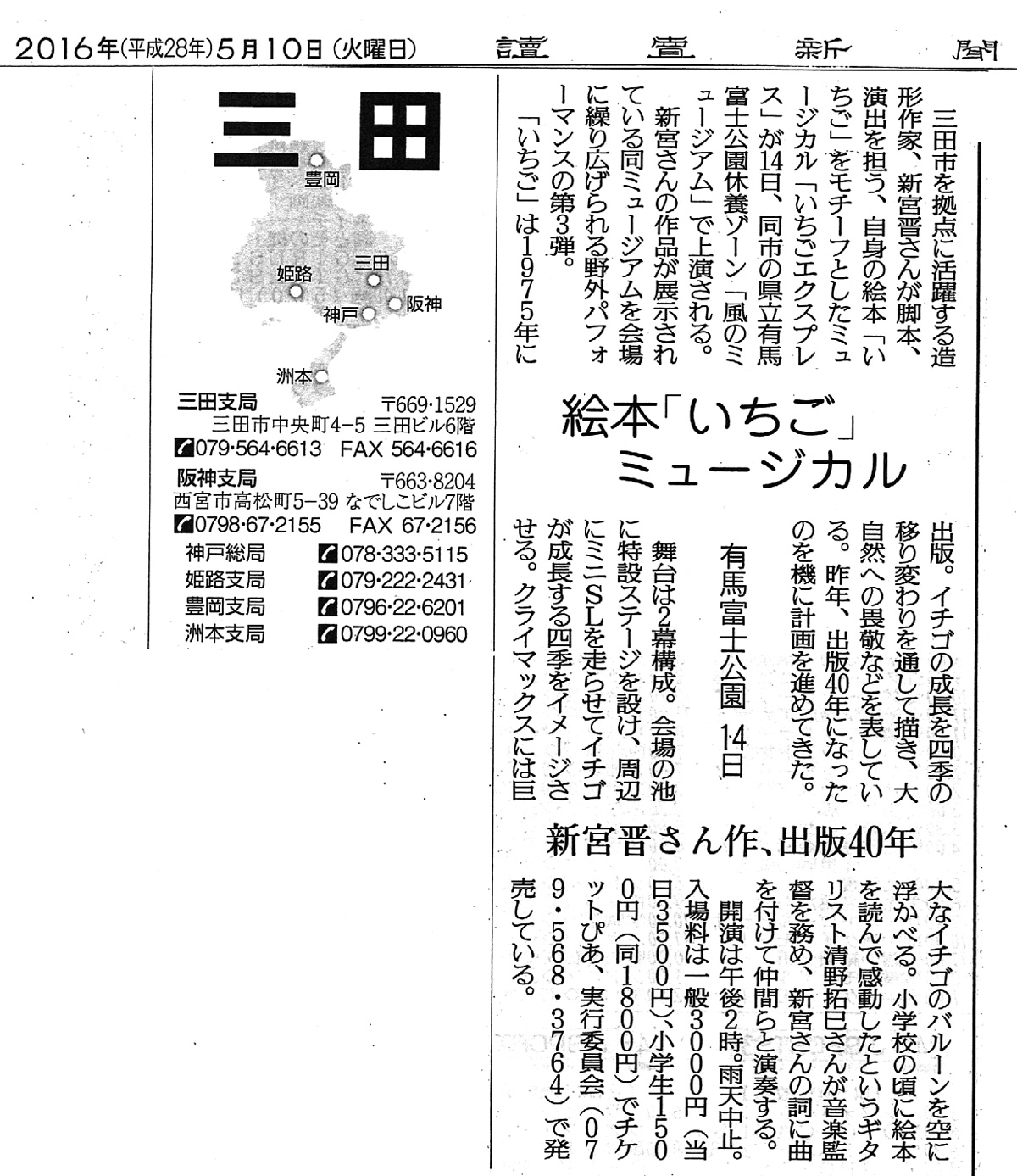 2016年5月14日 最高のお天気に恵まれ、兵庫県知事 井戸敏三や三田市長 森 哲男らの来賓に加えて、約680人の人々や子どもたちが会場に集まりました。三田在住の外国人、大勢の子どもたち、大道芸人といった多彩な出演者に加えて、池の周りを巡るミニSL、巨大絵本、いちごのバルーンが、主役の小さな「いちご」を盛り上げました。清野 拓巳を中心とするクインテットが素晴らしい音楽を披露し、ボーカルのMIKIKOが歌いました。 一冊の絵本から生まれたミュージカル「いちごエクスプレス」は、小さな「いちご」を通して、大自然の豊かさと、平和な世界の大切さを表現して見せました。