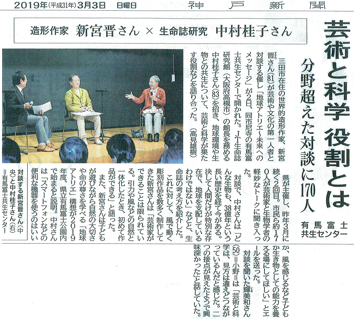 The series of dialogues Message to the Future No.2 was held at Kyosei Center in Arimafuji Park on March 2nd, 2019 between Ph.D. Keiko Nakamura, the director general of JT Biohistory Research Hall, and Susumu Shingu, coordinated by Isao Nakase, the director of the Museum of Nature and Human Activities, Hyogo. What a pleasant talk where laughter was constantly filled in the crowd! Dr. Keiko Nakamura looks at all the creatures on this planet gently, and Susumu Shingu plays with nature by making his sculptures. The spirit of their talk is how to play with nature on this planet.