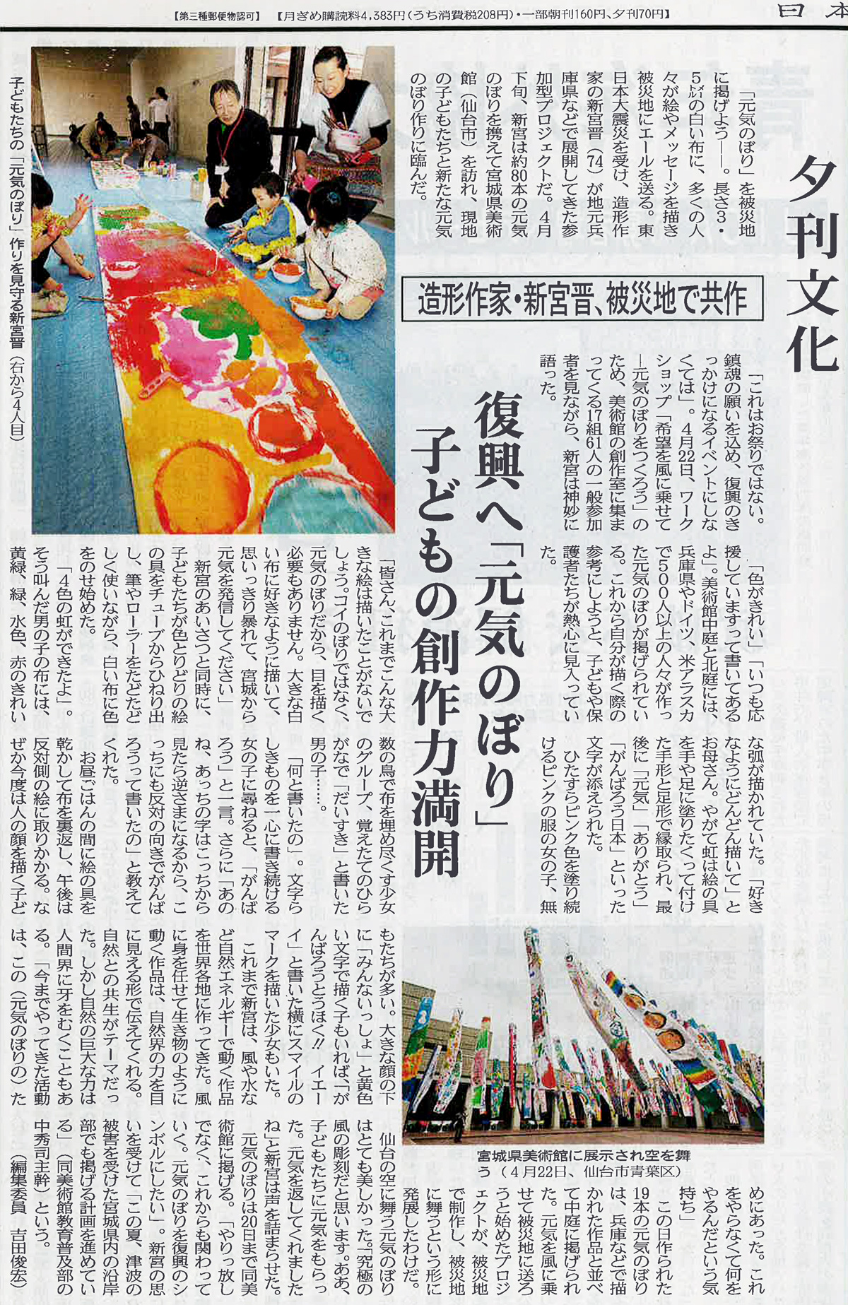 The participants of about 100 people including a lot of children drew energetic messages on Genki-nobori streamers. The completed 19 streamers were exhibited with other 78 streamers, drawn in Hyogo Prefecture, Germany and Alaska. The number of the streamers will increase as the local people will continue to participate in this project.